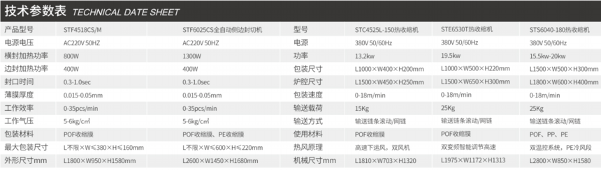 STF6025CS全自动侧边封切机+STS6040-180热收缩包装机 技术特性 Technical characteristics *STF6025CS全自动侧边封切机包装范围广,包装产品没有长度限制,超长物品可连续侧边封口,管材铝型材类,石膏线建材类、超长大礼盒类等均可使用。大物品箱体重物类,可选择PE收缩膜专用封切刀。 *可从触摸屏程序内调节横封切刀高度行程锁止。 *切刀高度可调,针对不同高度的产品选择适当的切刀高度,生产效率可大大提高。 *封口线高低可调,可将封切焊口线调节到盒子居中部位,有效地提高包装效果。 *人机界面,只需输入物品长度、高度,系统自动计算包装长度,可储存多种方案选用,可扩展功能。 *可快捷方便地更换包装尺寸。自动报警提示、故障自动检测,检修容易。 *热收缩机经济实用耐用,性价比高,可使用POF、 PE收缩膜均可。带有PE冷风段。加热采用双温控分区系统控制,结合热风循环式设计,热收缩温度均匀包装效果好。